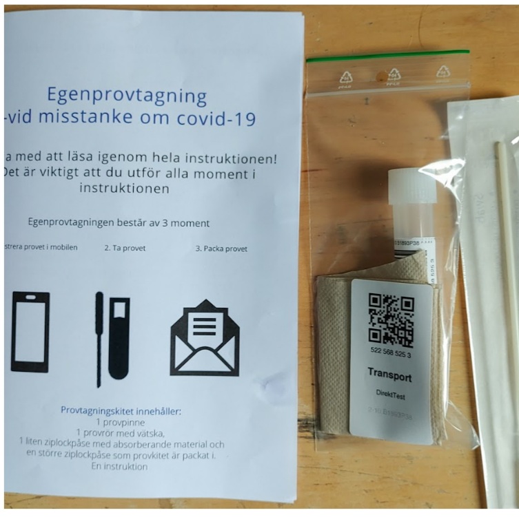Selang beberapa hari, tepatnya pada hari Senin tanggal 6 Juli di pagi hari jam 9:30 tiba-tiba saya mendapat telepon. Ternyata beliau adalah bapak supir taksi yang membawa perlengkapan tes. Saya turun ke bawah untuk mengambil perlengkapan tersebut dan si bapak taksi menunggu disitu sampai saya selesai mengambil sampel diri saya sendiri di kamar. Perlengkapan tes tersebut bisa dilihat di gambar di bawah. Untuk membimbing prosesnya, ada buku petunjuk, tapi tentu saja pakai bahasa Swedia. Google Translate memang menjadi aplikasi wajib untuk pendatang di Swedia. Sampel ini dilengkapi oleh barcode yang harus saya scan dan nanti akan terhubung dengan akun saya di website ketika mendaftar, sehingga tidak akan tertukar dengan sampel orang lain. Untuk tes ini saya tidak disuruh memasukan alat yang mirip korek kuping, hanya ukurannya lebih panjang, ke dalam hidung, tapi cukup untuk mengorek tenggorokan bagian paling belakang. Saya kira lebih mudah, tapi ternyata sama aja tidak enak. Berkali-kali muncul perasaan ingin muntah. Setelah tes selesai, saya berikan lagi sampelnya kepada si bapak kurir.