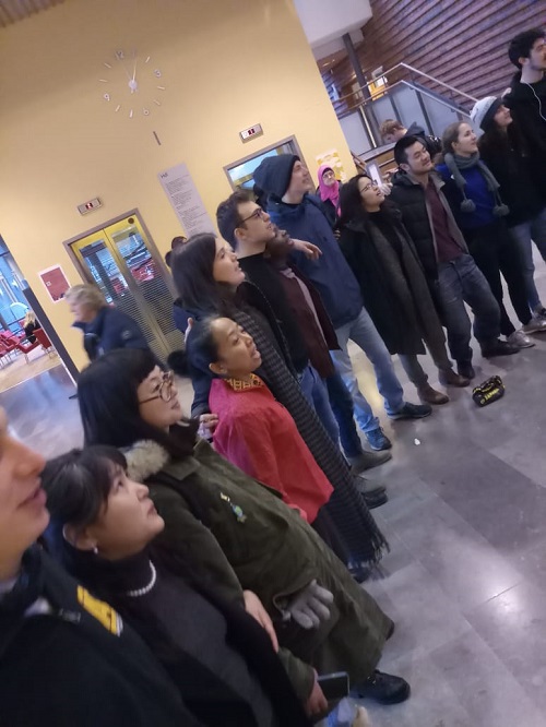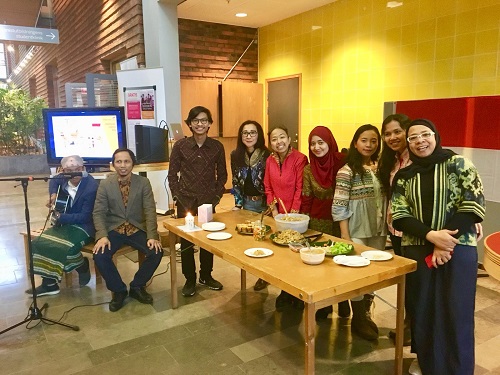 Menjelang penutupan acara, kami mengajak para pengunjung menari Poco-Poco. Suasana lobi semakin riuh karena aksi ini tentunya. Terdengar seruan “Dapet…dapet iramanya!”dari beberapa peserta yang mulai mengenal pola harmonisasi gerakan dan irama lagu. Tidak terasa satu jam durasi acara akan segera berakhir. Sekedar mengingatkan bahwa kita semua sesungguhnya adalah warga dunia, Jojo mengusulkan satu lagu yang mengingatkan akan universalisme mimpi pada perdamaian dalam keberagaman. Syair “Imagine” dari John Lennon pun terpampang di layar. Bergandengan tangan, seluruh pengunjung hanyut membawakan lagu diiringi petikan gitar Jojo. “Semua orang bisa begitu terlibat. Semua orang ikut bernyanyi dan menari. Masakannya enak dan kita belajar banyak hal tentang Indonesia,” Rita Stefanuto mewakili panitia pelaksana kegiatan Culture Day di kampus menambah kesan positif dari pengunjung akan pelaksanaan “Indonesian Cultural Day” yang sekaligus menutup rangakaian program Culture Day di Universitas Jönköping di tahun 2018.