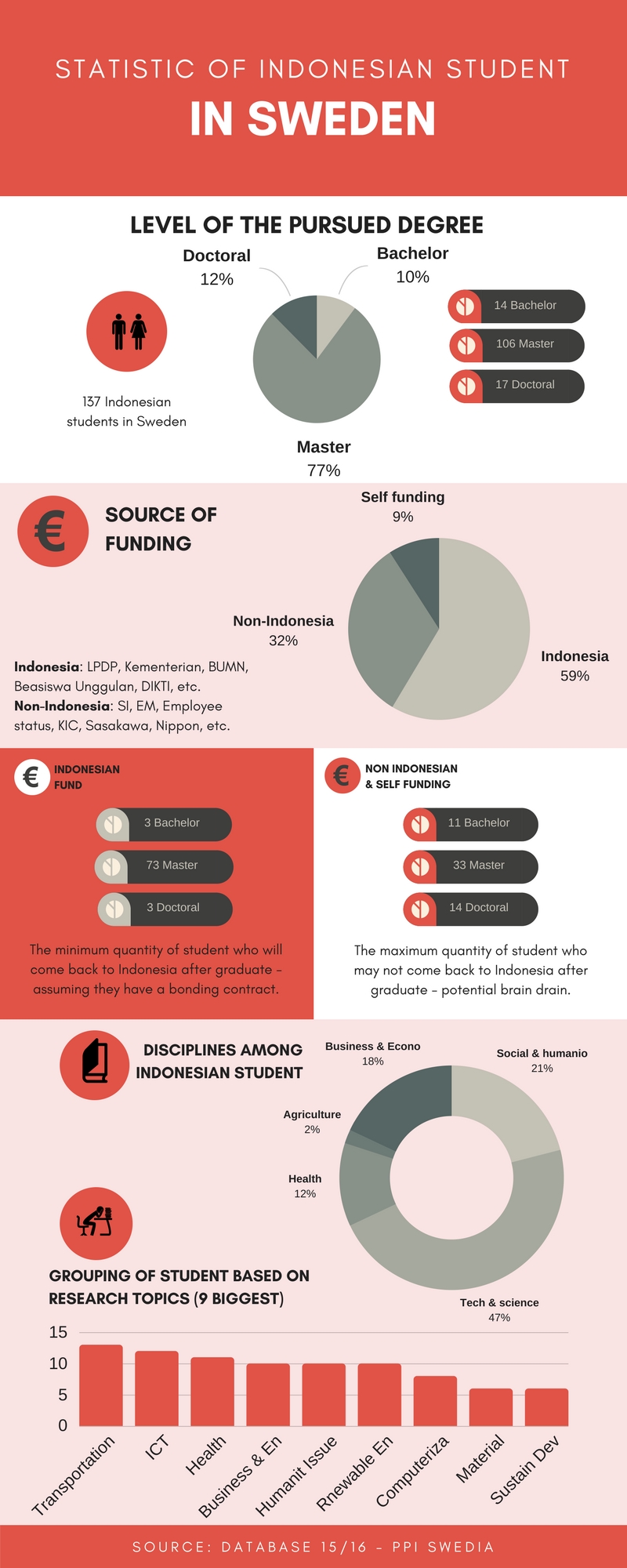 Berbicara mengenai hal itu, jika kita tengok dari sumber funding mereka, ada 59% dari seluruh mahasiswa Indonesia di Swedia mendapat funding dari Indonesia (LPDP, BUMN, Kementerian dll). Sedangkan 32%-nya dari non-Indonesia (SI, EM, KIC, atau beasiswa luar negeri yang lain). Dan sisanya adalah dari dana pribadi. Jika kita asumsikan data ini bisa menjadi gambaran rata-rata kondisi diaspora Indonesia per tahunnya, maka per tahunnya minimal ada 59% atau 79 lulusan pendidikan Indonesia dari Swedia yang akan meneruskan karir di Indonesia. FYI, beasiswa pemerintah Indonesia biasanya mewajibkan penerimanya untuk kembali ke Indonesia setelah kelulusan. Kalaupun tidak ada kontrak, biasanya ada beban moral untuk kembali mengingat Indonesia merupakan negara berkembang yang mengalami krisis finansial – yah bisa panjang, lebar, tinggi, dan waktu yang lama kalau bahas tentang ini sih ya 😀 . 79 mahasiswa Indonesia tersebut terdiri dari 3 mahasiswa S1, 73 mahasiswa S2, dan 3 mahasiswa S3. Ini merupakan angka yang menggembirakan bagi progress kemajuan Indonesia.