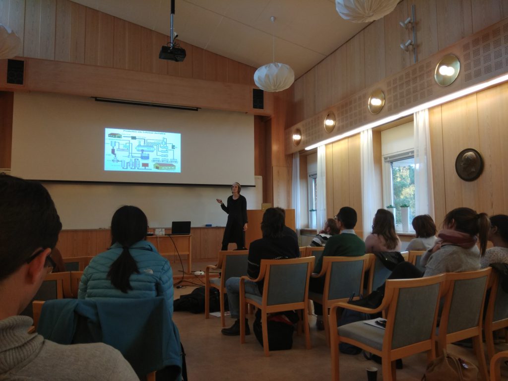 Tepat jam setengah satu siang, kami berkumpul di aula untuk sesi presentasi dari beberapa perusahaan. Presentasi pertama diisi oleh Domsjö Fabriker, perusahaan yang bergerak di bidang biorefinery. Produk utamanya adalah selulosa, lignin, dan bioetanol dengan aplikasi beragam; misalnya selulosa untuk bahan tekstil, lignin untuk bahan bangunan dan bioetanol untuk bahan bakar. Bahan baku yang mereka gunakan adalah pohon jenis softwood seperti pinus dan cemara yang merupakan ciri khas tumbuhan yang sesuai dengan kondisi iklim Swedia. Domsjö sendiri merupakan bagian dari Aditya Birla Group, perusahaan multinasional yang berbasis di India.