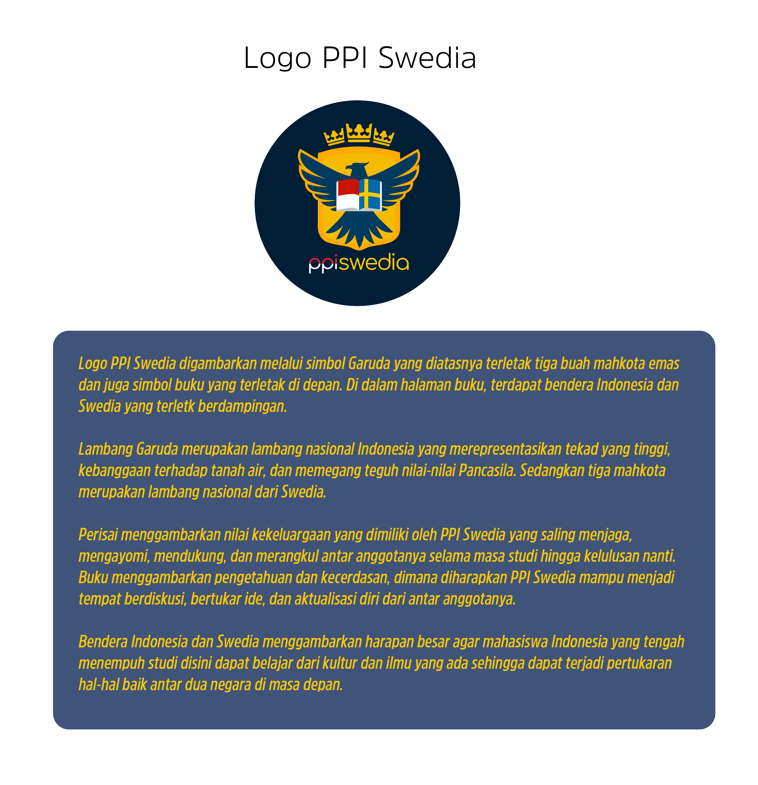 PPI Swedia memiliki logo yang merepresentasikan visi dan misi pelajar Indonesia yang tengah melakukan studi di Swedia. Pada Januari 2019, Logo PPI Swedia mengalami perubahan. Logo PPI Swedia ini merupakan karya dari Fadhil Mochammad (KTH Royal Institute of Technology). Berikut adalah logo dan makna dari Logo PPI Swedia: