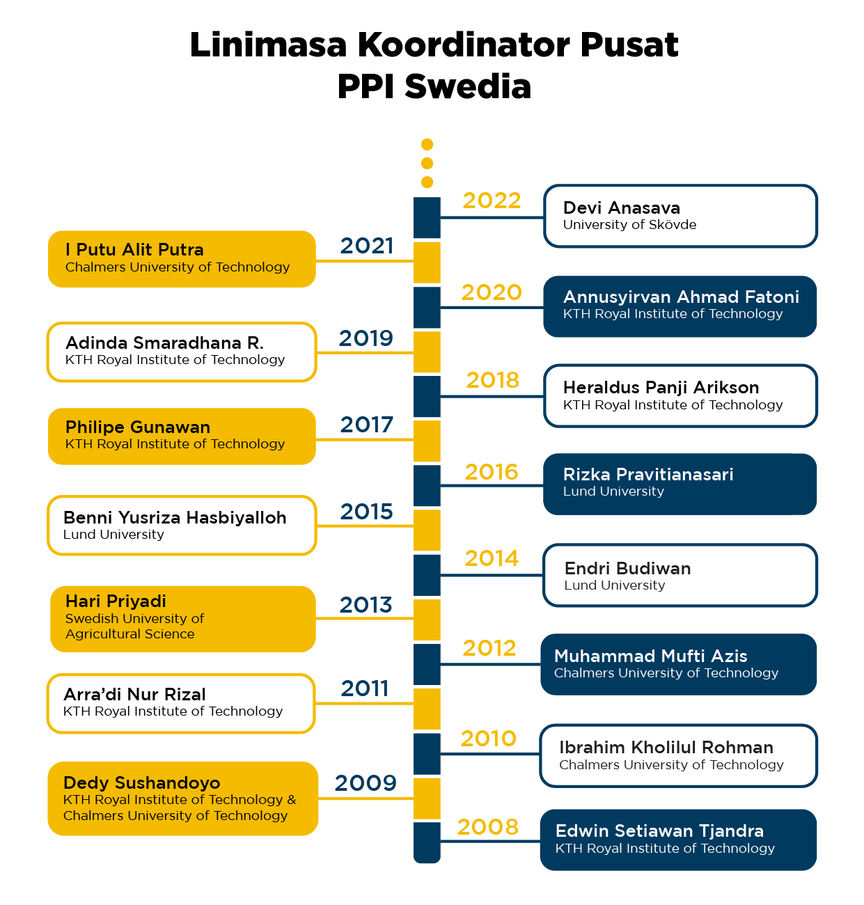 Berikut adalah infografis koordinator pusat PPI Swedia sejak tahun 2008 sampai sekarang :